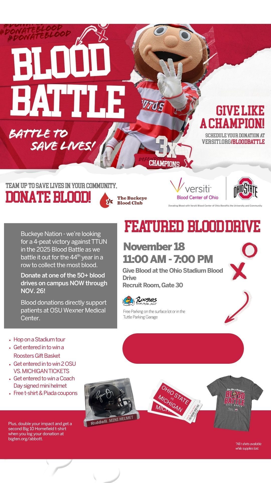 The 2025 Blood Battle runs from October 22 to November 26, and the goal is simple: donate blood on Ohio State’s campus and keep the trophy where it belongs.